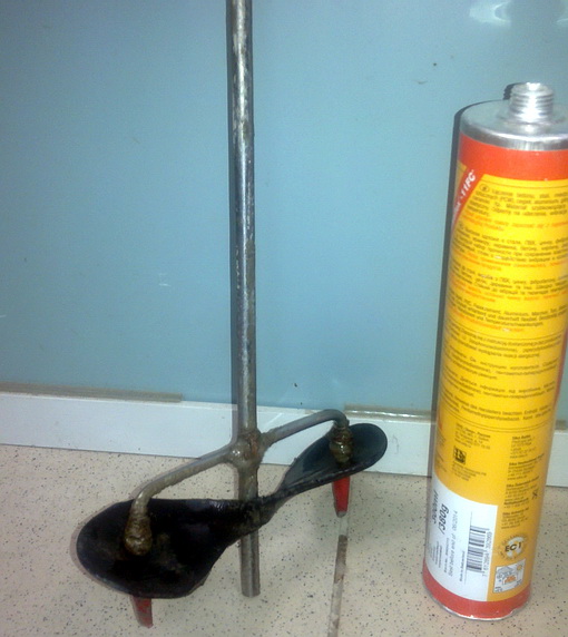 Родная большая насадка-мешалка заменена на мешалку меньшего диаметра такой же конструкции. Так удобнее замешивать раствор. |