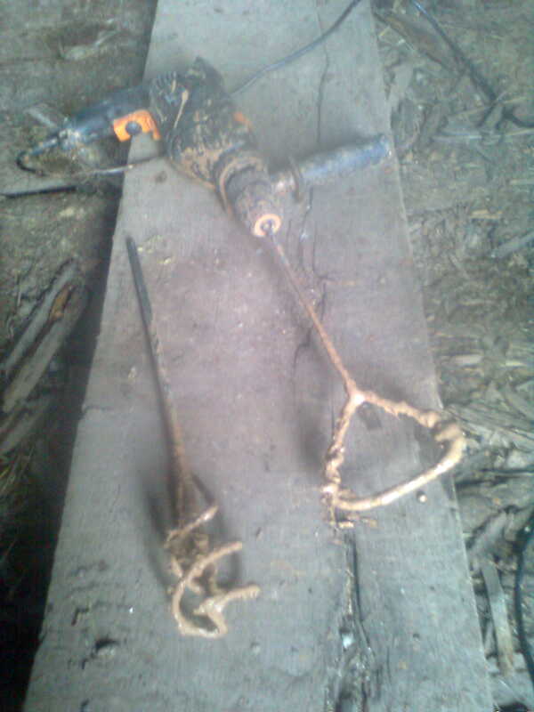 Глина замачивалась недели 3. Вчера попробовал разбить комки покупной насадкой, как на фото у IgorUA. Бесполезно. Пришлось из катанки колхозить. Дрель на 700 ватт, справилась с 30 литрами замеса. При работе даже воронка на поверхности. Считаю, имеет право на существование, не требует сварки.