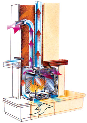 тут вроде видно. что воздух поступает снизу через дровяницу и обтекает топку по бокам (между топкой и облицовкой или все-таки по каналам внутри стенки самой топки?).