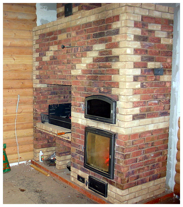 собственно печь, выполнение на кирпиче ручной формовки искуственно состаренном..