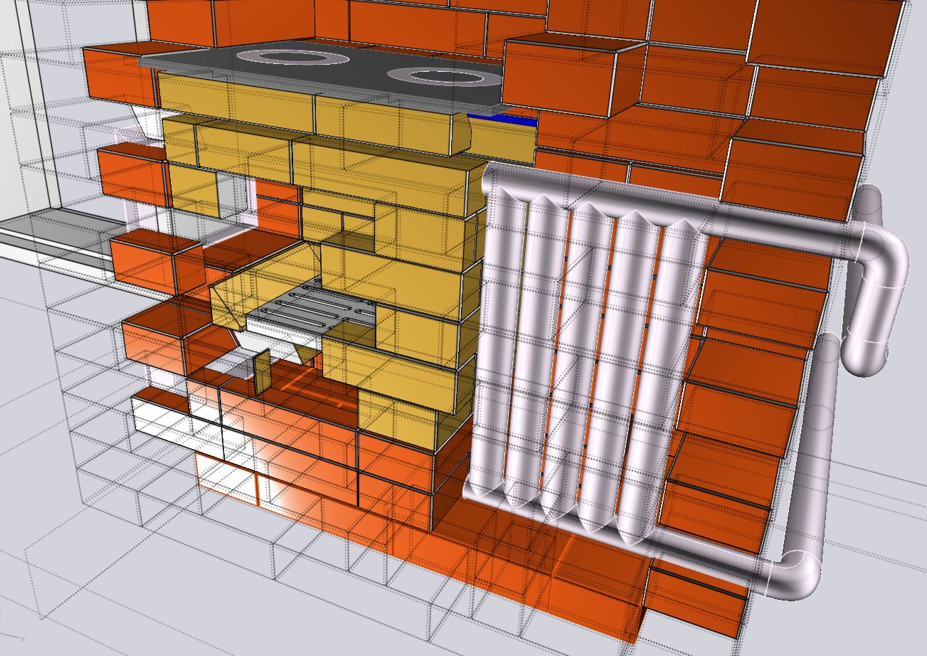 Внутри в дымоходе кирпичи срезаны, чтобы образовать канал без ступеней(срезы под градусом) при кладке буду брать из проекта каждый кирпич и делать все по программным размерам. И печь не передвинуть к дымоходу, так как водяной контур упрется в заднюю часть печи, а она вплотную к несущей........