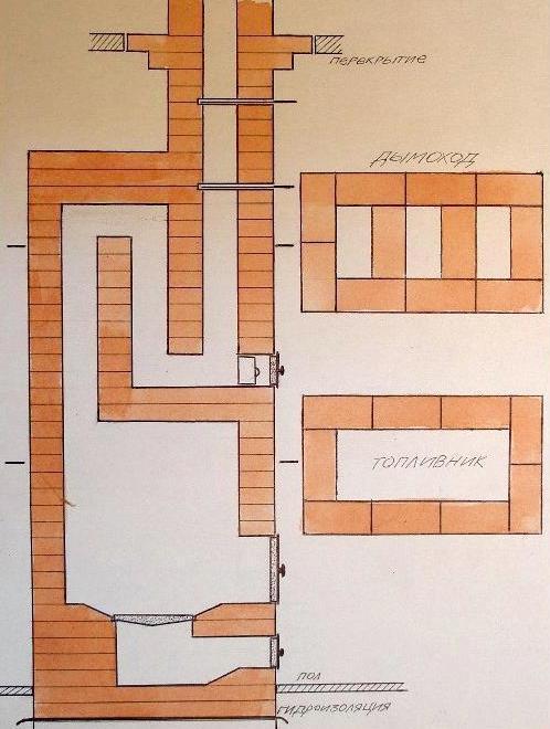 Вот сваял побыстрому картинку. Корел снёс весной вместе с вирусами, пришлось шариковой ручкой и кисточкой. Проект самый обычный. Разделка на самом деле больше,отлита цельной плитой толщиной 6 см из кирпичного боя трёх фракций с арматурой, от дыма 37 см. Внутреннее сечение трубы 13на13см. В чистке самозаклинивающиеся полкирпича с ручкой , оставлены в дымоходе во время кладки печи, при необходимости отодвигаются внутрь или притягиваются за ручку к отверстию чистки. Внутренние поверхности максимально гладкие и ровные, иногда в ущерб наружной поверхности, в процессе кладки очищались и отмывались влажной тряпкой от остатков раствора. Если перевязку иногда не удавалось сделать, перпендекулярно шву фрезеровалось Z-образное углубление и туда вставлялась такой же формы стальная закладка. ну и может ещё чего делал вспомнить не могу. Гориз.сеч. 50 на 90. боковая стенка 210 на 90.