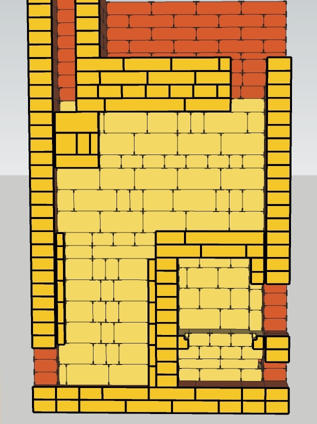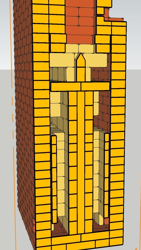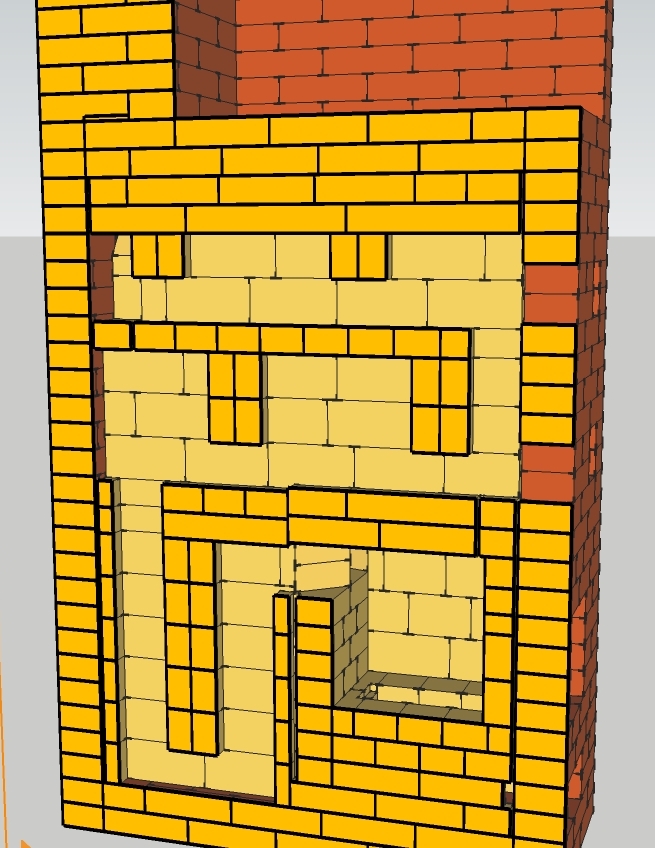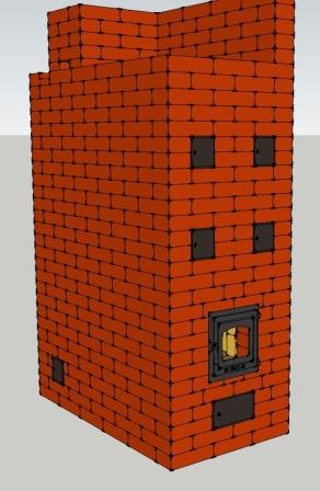 Представляю на обсуждение печь с калориферным каналом теле печи(внутри шамотного сердечника).Калориферный канал на проекте без изоляции для газоплотности жестяным коробом. Для герметизации в кирпичах пазы и проложены ламели из нержавеющих пластин. Данный проект предоставляется как тех.решение без технических тонкостей для самостоятельной кладки.