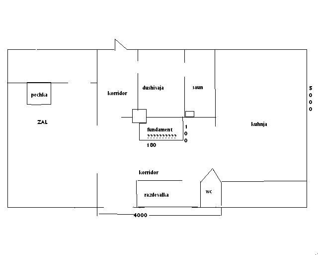 Если поставить печку в коридоре, то в душевой будет тепло от ее задней стенки (перегородка убирается.), а если поставить печку на кухне на новом фундаменте, и поменять расположение душеой и сауны, то можно иметь теплую душевую и кухню от ождной печки. Если варочная функция печки на кухне не востребована, то в коридоре можно поставить кирпичный отопительный котел, развести батареи и отапливать все помещения от одного котла.