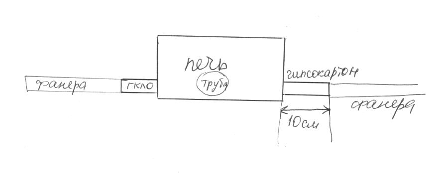 Нюточка. У меня в бане в 30см. от трубы, на чердаке расплавился утеплитель, вспененный полиэтилен,но правда на открытом пространстве и на метал. листе, но от трубы. А у Вас печь, фанера и 10см. Evil or Very Mad Зачем такую красивую печь и дорогую, да в перегородку. Она все потеряет. И Вы подумали ,как у Вас труба пойдет. В стене.