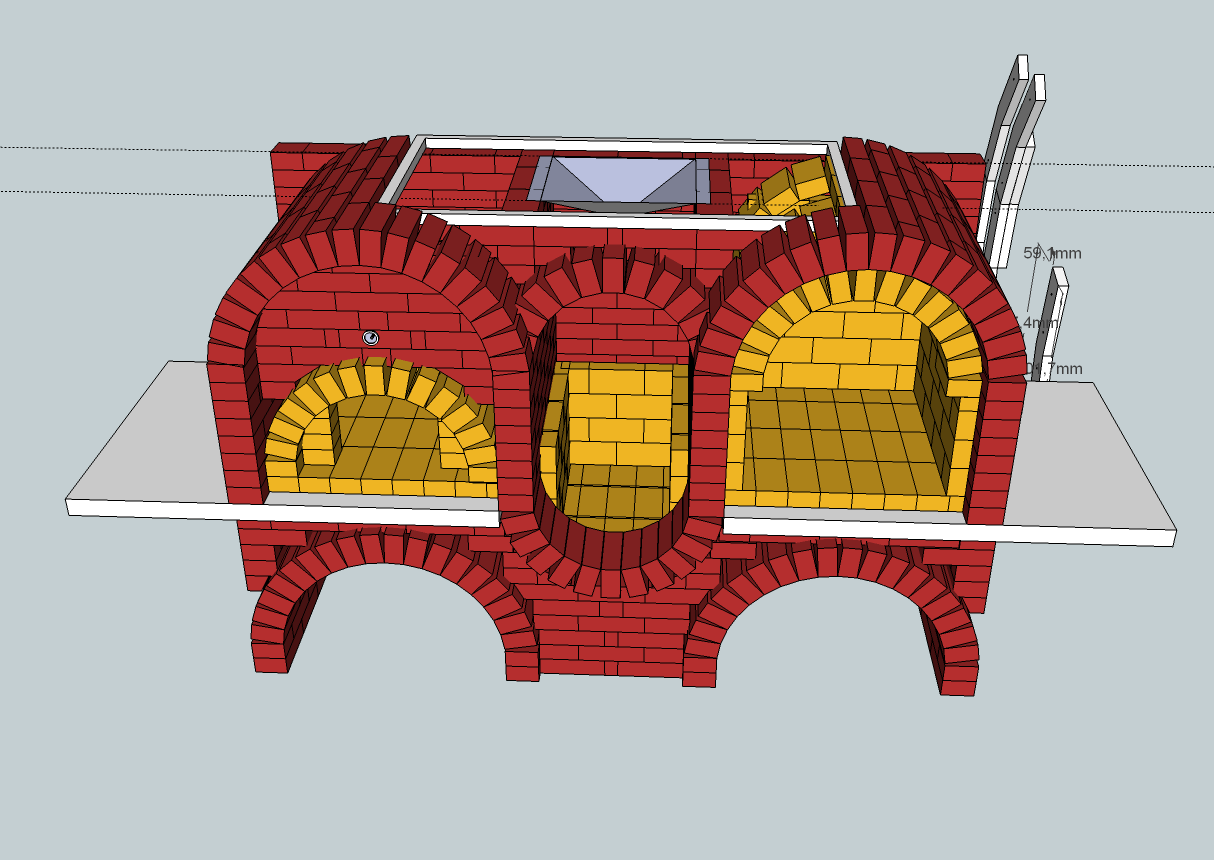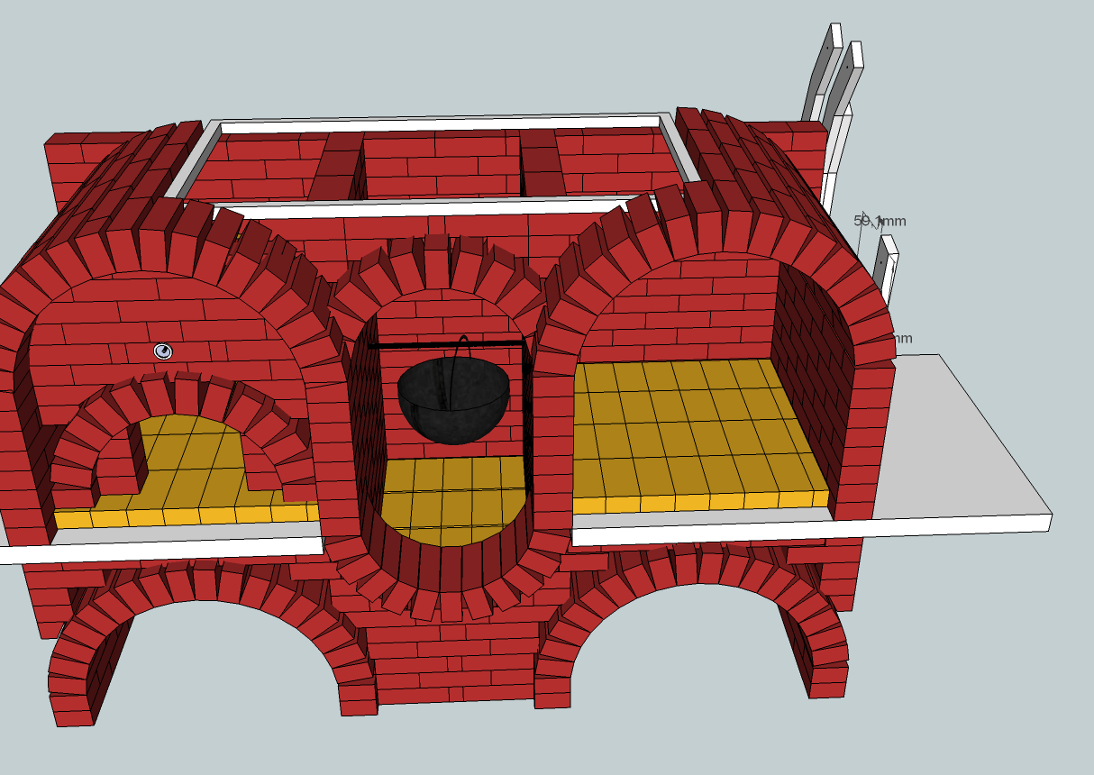 | Нет дымосборника на мангале,чтобы он получился надо поставить перемычку и стенку там где начинается арка. В этом случае получится(сформируется) полноценный дымосборник(камера дымовая) И в среднем очаге тоже самое. |
