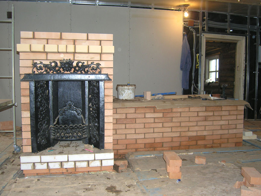 если вы про уголок над камином, то это элемент чугунного экрана а не работа печника