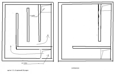 | Позвольте высказать такую мысль : чем больше теплосъёмных поверхностей по ходу дыма - тем эффективнее система. Следовательно в первом варианте на картинке те три вертикальные перегородки делаем не сплошные, а с дырками через каждый ряд, то получаем этакое сито для прохода дыма разной тяжести с большим количеством, площадью поверхностей. |