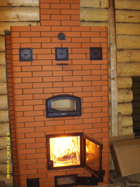 Труба в деревянную стену не идёт,ибо стена может поплыть !В камин дверцу поставите-задняя стенка его греть не будет во время топки печи,да и размер дверей ограничен...А труба наша греется не сильно.