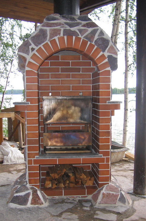 На самом деле это не барбекю, а просто шкаф из кирпича, облицованный диким камнем, и в этот шкаф вставили мангал - нижнее отделение для золы, а сверху - мяско жарят... Smile снизу - просто дровница.