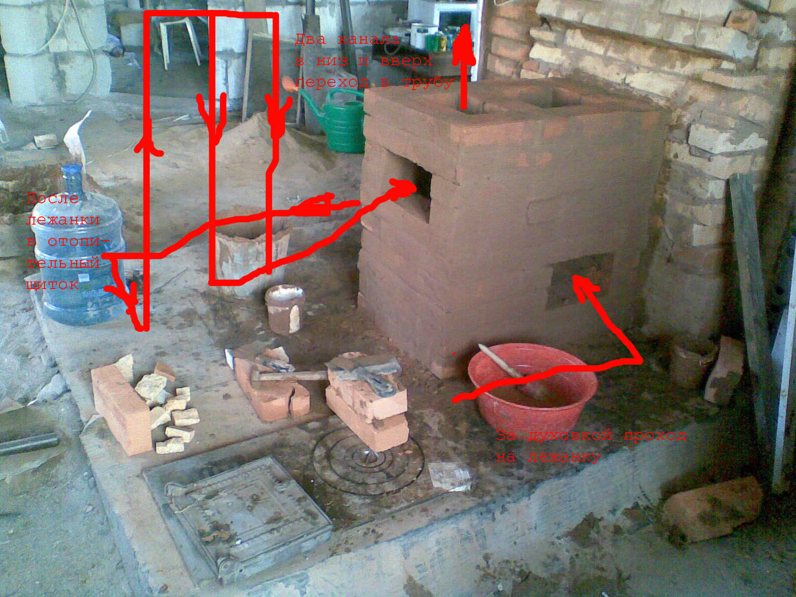 У нас вопрос. Можно, как обозначено на рисунке проложить каналы дымохода? ( на рисунке, где лежит плита, будет плита с духовкой, расположенной правее дверцы топки). На фото находится начало стройки трубы с двумя каналами. Больший канал для камина (выше, где будет в него заходить под углом 45 град. дымоход камина, он будет перекрыт). Нижнюю ее часть хочу использовать для летнего канала, с задвижкой и переходом во второй канал, для печи. В нижнее отверстие предполагается пропустить дымоход. С обратной стороны планируется разместить лежанку (точнее сиделку, короткое пространство). По середине отопительный стояк с двумя опускными каналами. Далее как нарисовано на рисунке. Труба будет 7 метров. Много читаю про печи и их конструкции, практики 0. Мой товарищ говорит, что так никогда не делал таким образом и сомневается, что вся конструкция будет работать. (У коллеги по работе сделано что-то подобное, но при зимней топке ему приходится открывать прочистные дверцы и вставлять туда подоженные газеты - что приводит в выхлопу резкому - и тогда с гулом появляется тяга... ) Посоветуйте, пожалуйста, что-нибудь приятное...