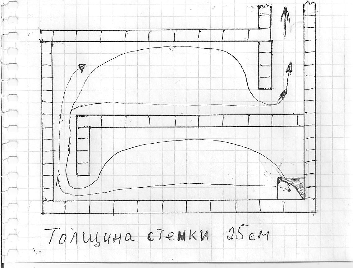 Называть можно и по логину, я согласен. Художник я плохой. Насчет размеров:выход с топки в первоначальном варианте был на одном уровне с входом в трубу, я сделал перегородку высотой около 70см - температура в колпаке поднялась, но это приблежает данную конструкцию к последовательным каналам. Хайло выхода газов с топки сечением 25х12см, перед дымовым каналом сечение 37х12см, это получилось после установки перегородки. Вьюшку закрывал так, что сечение канала оставалось 17х4см. Горит нормально, но эффект хуже. С дровами вроде работает получше. Кажется что тяга сильно большая и все вытягивает в трубу. Но уменьшение тяги эффекта не дает. Карман сложен кирпич на ребро.