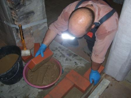 Когда начинал строить печи тоже частенько рукой клал раствор, но если этим заниматься каждый день то рук на долго не хватит, особенно весной и осенью, к тому же на каминах и грилях частенько применяется раствор на цементной основе который просто разъедает руки. Поэтому работаю переделанным под себя мастерком раствор счищаю щеткой.