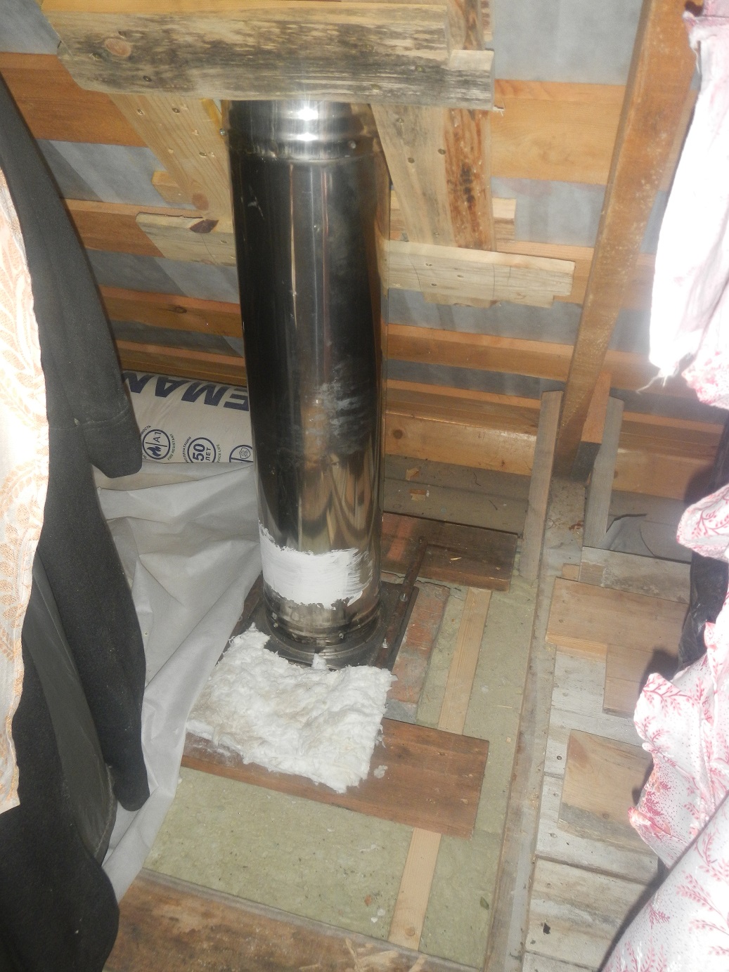 Вообще кирпичную трубу мы уже сложили сами. До этого был горизонтальный сендвич в стену, а потом колено и наверх. |