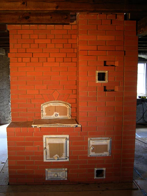 Отопительная печь с каменной (хлебной) духовкой и большой чугунной топочной дверкой.