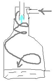 Изобразил от руки. Пыльный поток входит через гризонтальный патрубок в вертикальный цилиндр так чтобы струя закручивалась вокруг ветикального патрубка, пыль прижимается к стенкам цициндра и оседает вниз в воду. Чистый воздух отсасывается в вертикальный патрубок пылесосом.Ёмкость это цилиндрический бак из под чего то, сам циклон у меня сварен аргоном из нержавейки, людям заказывл у жестянщика из оцинковки.