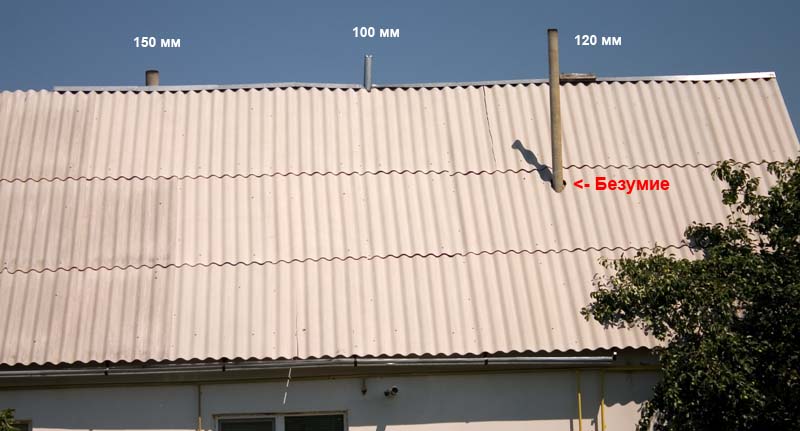 Ниже даю 2 фотографии дома под Киевом, на котором поставлено 3 асбестоцементные трубы (одна из них дополнительно снаружи утеплена) и металлического дымохода (неутеплённого), который работает с газовым котлом. Проходка крыши этими дымоходами — настоящее безумие. Но несмотря на указанные недостатки дровяные печи (и русская печь в том числе) в этом доме работают исправно с асбестоцементными дымоходами такого диаметра.