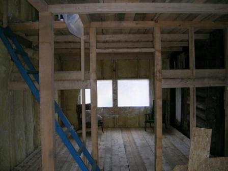 | Кухня. На фото мы в прихожей, дальше не обшитая перегородка и справа за ней планируется печка. Труба как можно ближе к перегородке, т.е. к коньку. |