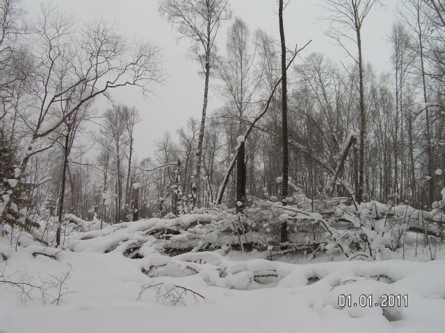 | Пошёл на лыжах прогуляться, протока завалена деревьями и снегом. Да ещё и летний ураган. |