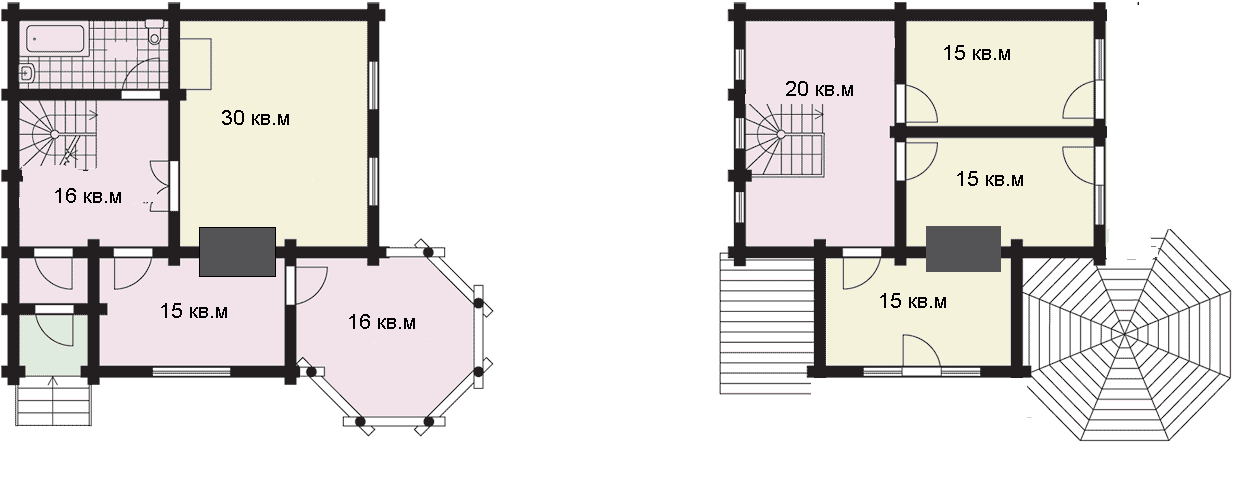 Вот план дома. Тёмно-серый прямоугольник планируемое место для печи. Высота потолка первого этажа (левое изображение) 2.9 метра, высота потолка второго этажа 2.7 метра. Дом дачный, зимой будет эксплуатироваться. Печь нужна исключительно для обогрева (т.е. без варочных поверхностей и духовок). Под печь фундамента нет.