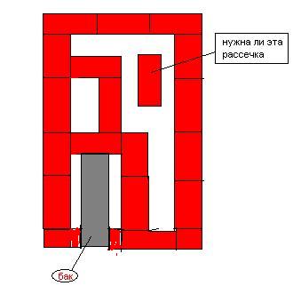Думали над вашим советом расположить бак в колпаке.Придумали только так как на рисунке.По другому не позволяет планировка и схема разводки.Есть ли смысл в таком изменении.И нужна ли все-таки рассечка.Еще вопрос. У нас печные кирпичи продаются неровные.А шамотные вроде получше.Можно ли сложить печь из одних шамотных.И не будет ли какого-нибудь побочного эффекта.