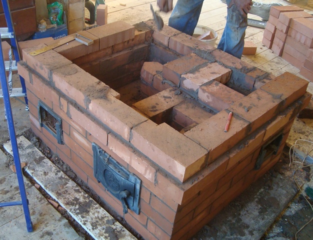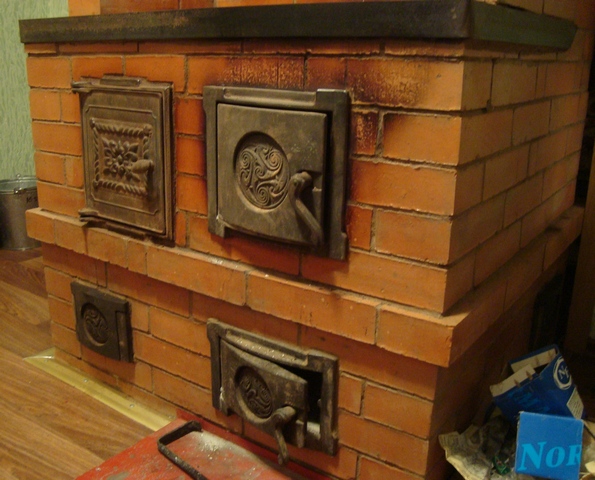 Самоделка-вариация на тему шведка. Фотографии соответсвуют, просто на одной вводит в заблуждение пачка досок. По духовке: 1 опустить на ряд, но не ниже топочных дверок 2 под духовкой нет отсечки для прогревания правого нижнего угла, грется дно будет по диагонали. Сам пользуюсь одним правилом не меняю площадь сечения каналов ДГ вокруг духовки до подьемного инебольшой прогар из топки.