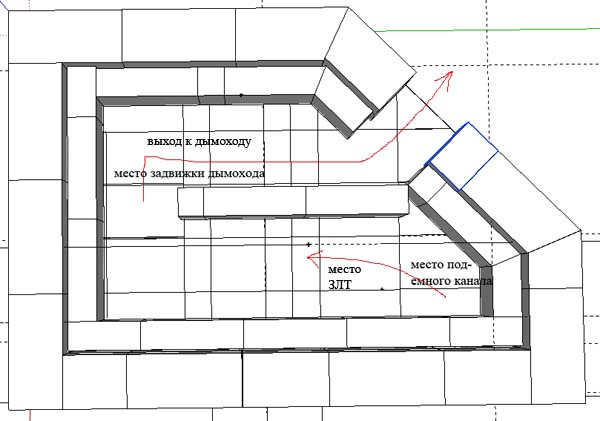3. Подъемный канал во колпак делать в крайнем правом углу с площадью соответ диаметр. дымохода. Рядом, ближе - ЗЛХ. Во втором колпаке забор воздуха в дымоход делать в крайнем левом углу.