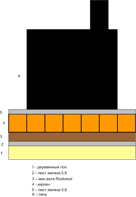 Прошу у знатоков помощи: посмотрите такой вариант установки печи на предмет дополнительной защищенности пола от возгорания и высказать свои соображения.