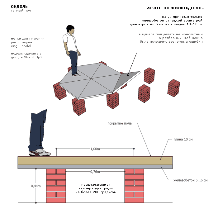 Если серьезно: можно рассматривать вариант теплых полов с жидким теплоносителем (современный вариант), а теплоноситель греть кирпичным дровяным котлом СДГ. Здесь как раз много конструктивных и эксплуатационных сложностей и есть простор для серьезного теоретического изучения.