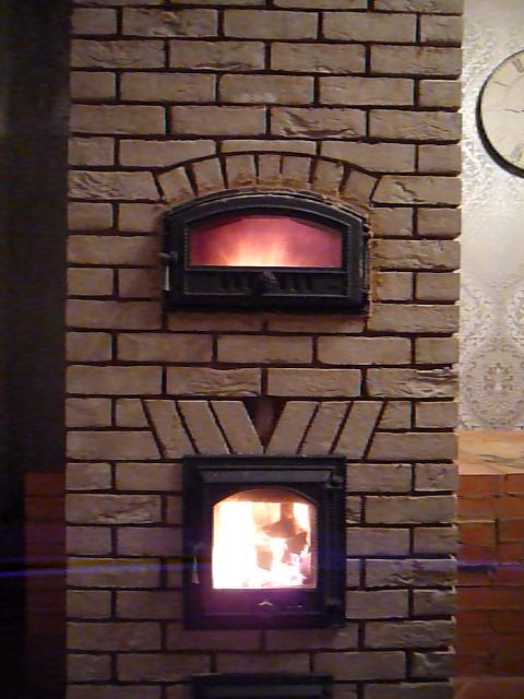 Вот, немножко фотографий с первого запуска печи. Печь, пока, с небольшими недоделками.. Вокруг дверки духовки замазана мокрым песком щель,через которую в первые минуты розжига просачивался дымок. Понадеялся, что поддымливания не будет через нее, а и не было бы, но при установке трубы(сендвич) последний метр не стал ставить без растяжек, показалось хлипковато. А существующего метра выше кровли до линии в 10градусов - не хватило буквально сантиметров 30-40, и при даже легком ветерке с другой стороны конька в зоне трубы образуется зона повышеного давления. А вентиляционный стояк на 4канала находится как раз с другой стороны . И когда я слез с крыши и показал хозяину дома, как печь вместе с трубой работают во время ветра приточной вентиляцией , он погруснел, да и у самого неспокойно было на душе.