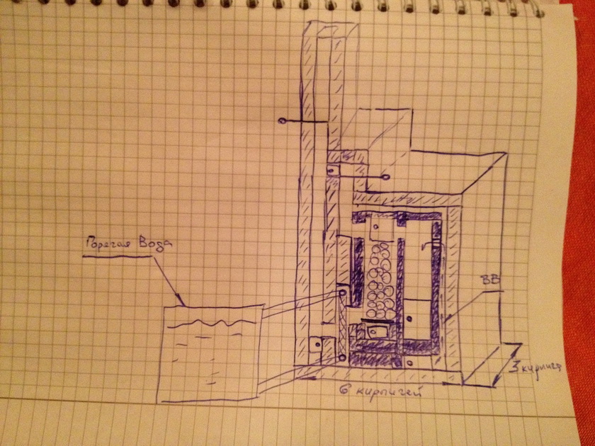 -рабочий ход, обрушивается на камни сверху, скозь них, в низ камеры для камней, обогревает регистр для горячей воды (труба 2 дюйма примерно) и в трубу!! Регулировку прогрева и тяги, предполагаю подбирать путем поиска оптимального расположения камней в закладе.