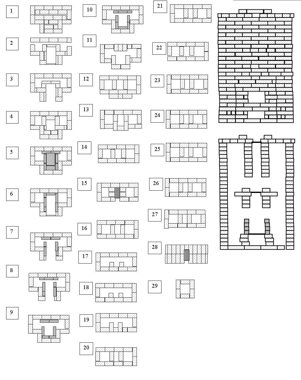 33 ряда по 7 см, размер по 1-му ряду 4х4,5 кирпича, режим открытого камина и отопительной теплоёмкой печи с однократной топкой...