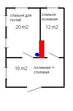 Годится любая печка с периметром около 4-5 м, в данном случае более длинная, чем широкая, чтобы не пропадало место, например 3 на 6 кирпичей, в т.ч. возможен и вариант с лежанкой в большей комнате.