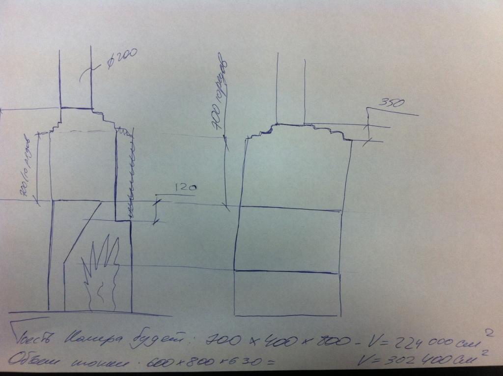 Вот такая схема подойдет? соотношение дымосборника к объему топки 3/4.Или лучше дымосборник сделать еще больше?