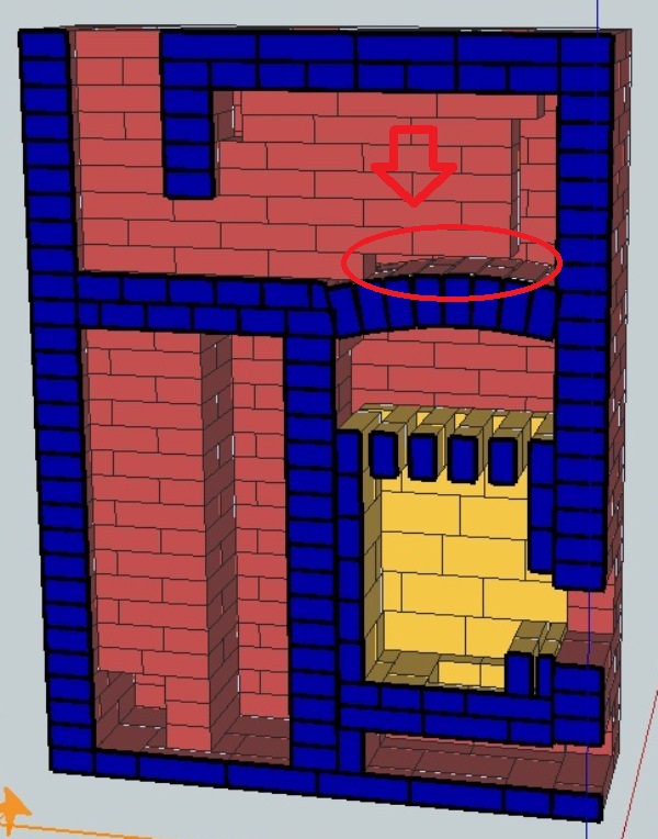 Мне не нравится, т.к. есть подозрение, что при такой компоновке, будет невозможно хорошо прогреть всю печь, а щиток, скорее всего треснет и "отойдёт" от корпуса печи, по границе(по внутреннему углу), а сам щиток, при хорошем нагреве, может треснуть по диагонали, из за расширения внутренней перевязанной перегородки, которая образует колпак, и перекрышу.