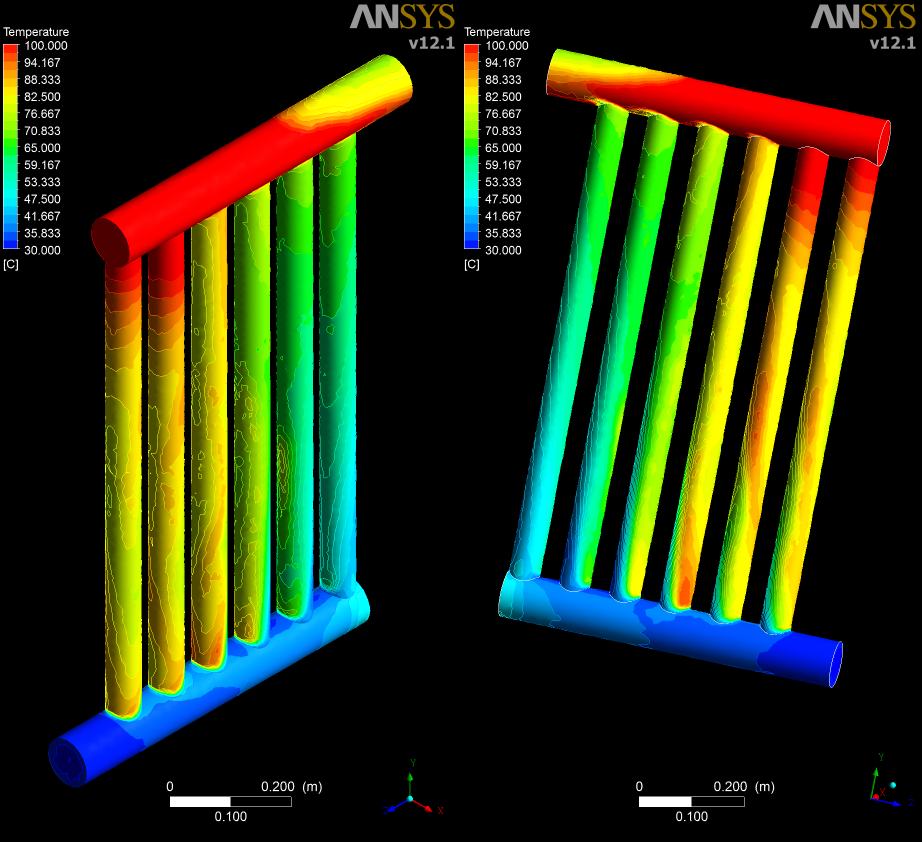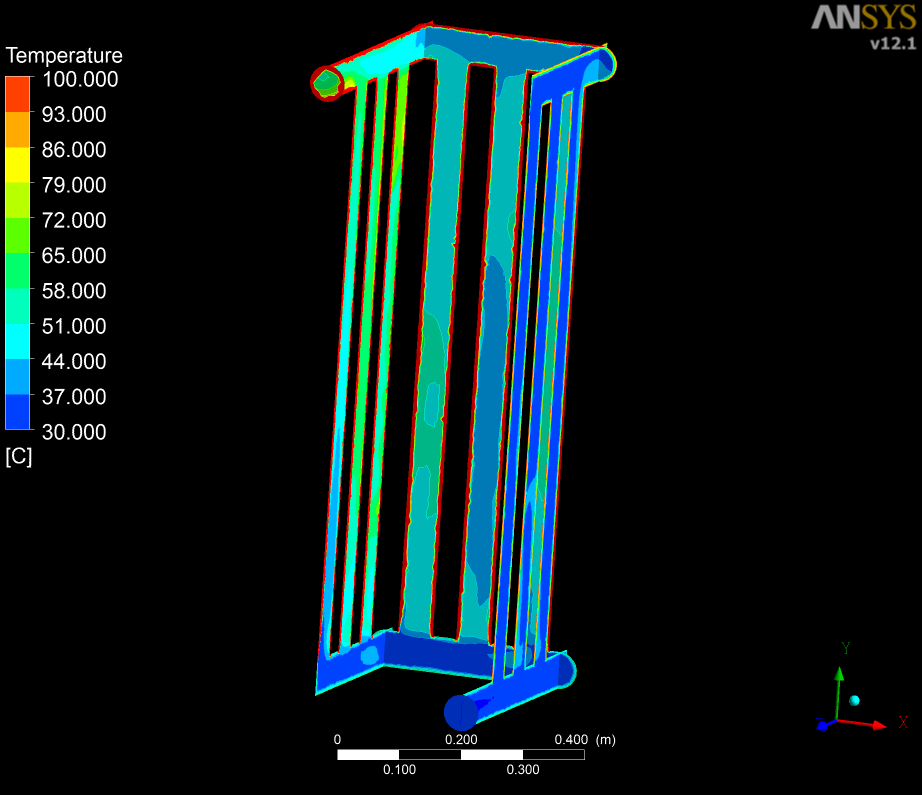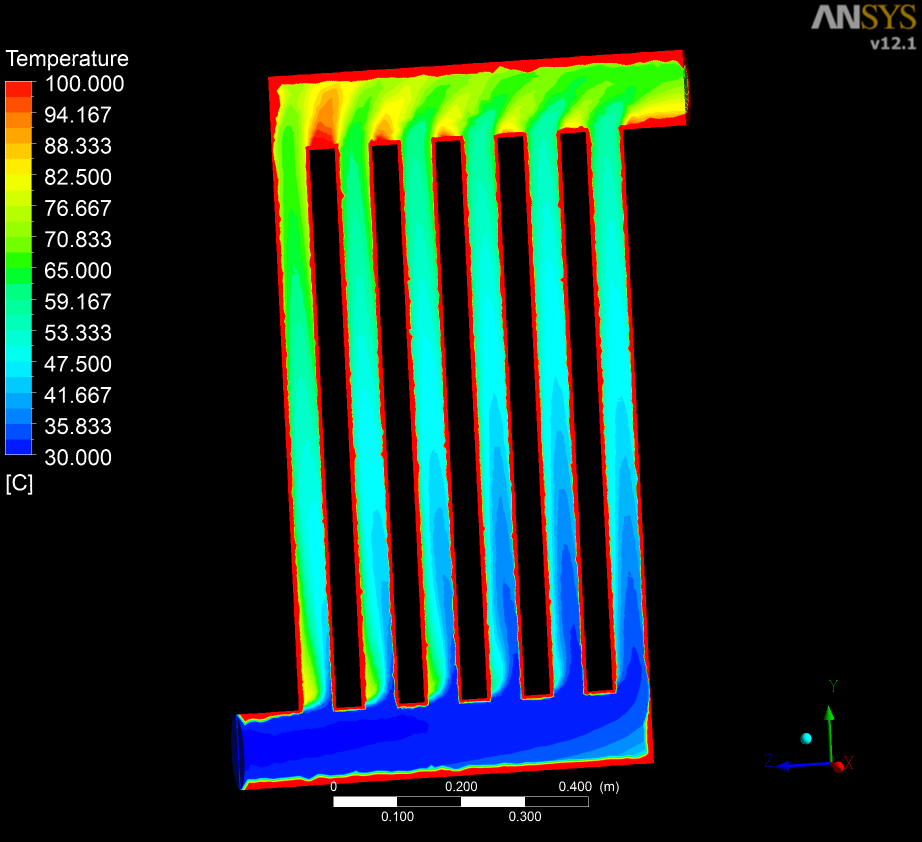 Задача была поставлена, для проверки ПЦ, поэтому теплоноситель подается с известным расходом. Если бы не было расчета гидросопротивлений, то было бы более равномерное распределение температур.