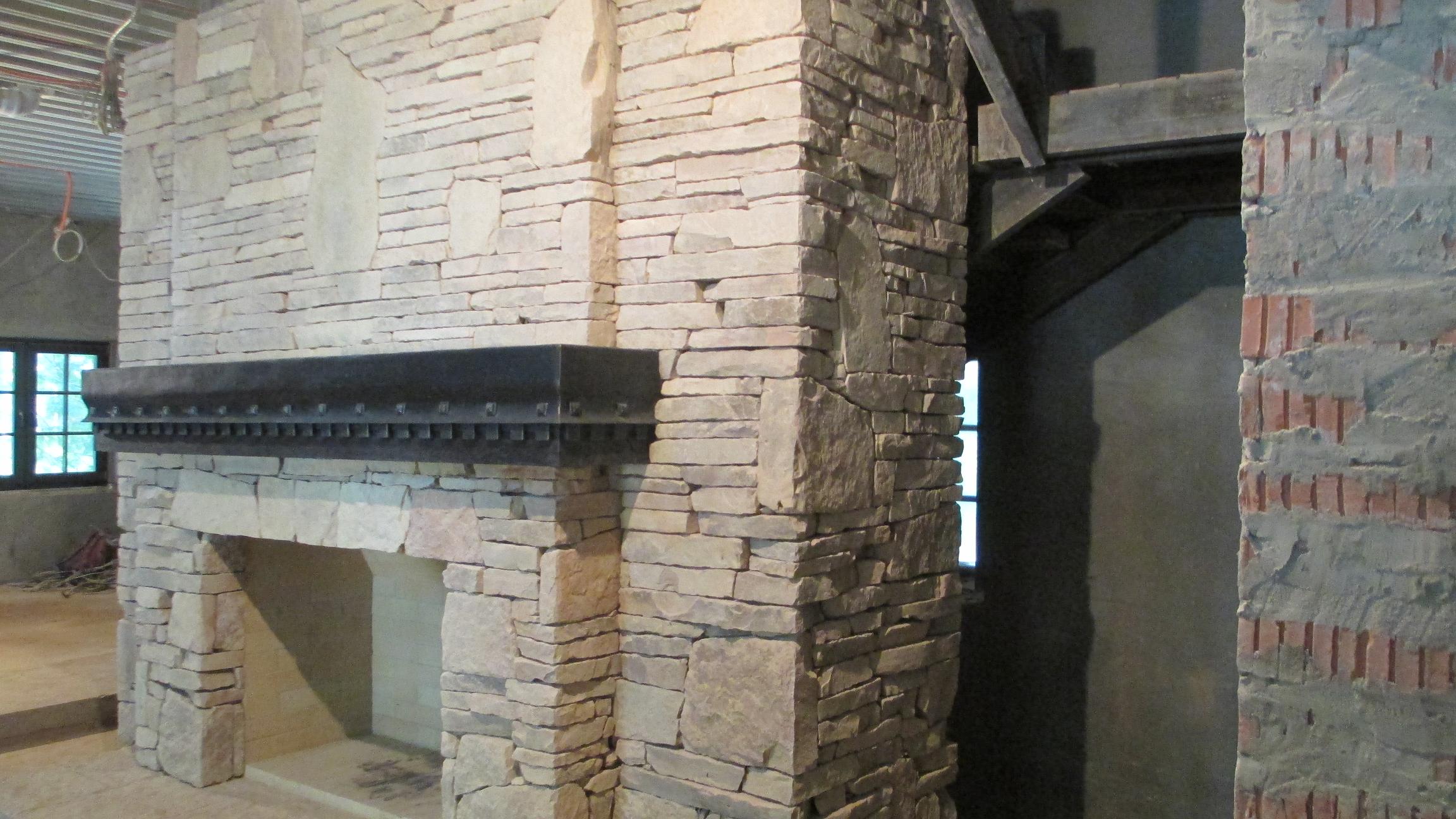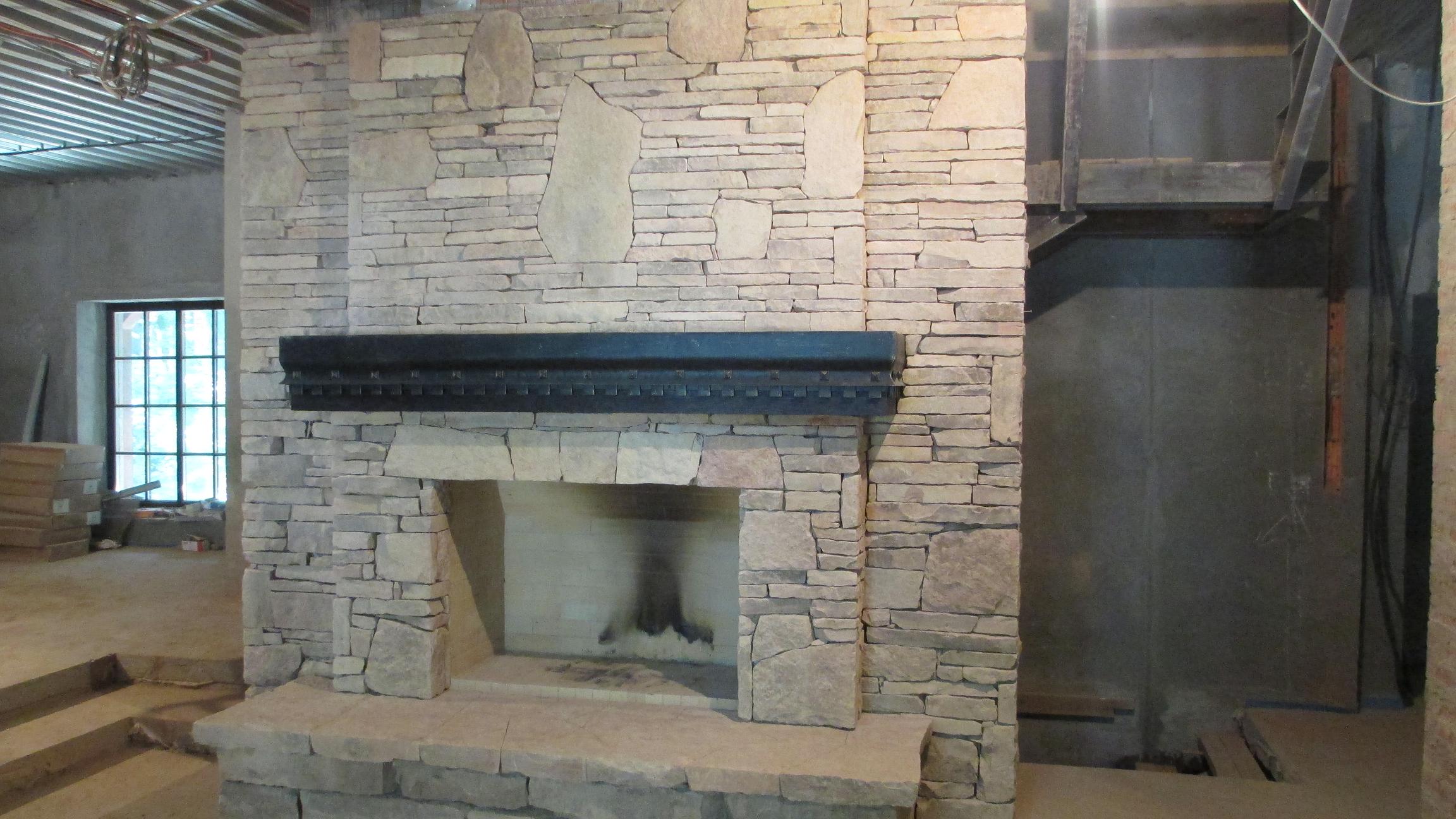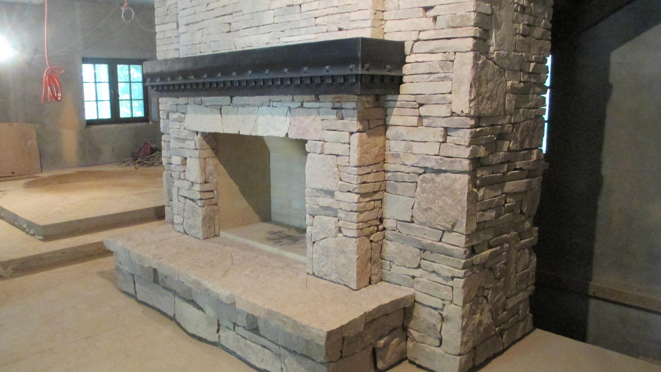 Камень что то близкое к слоистому известняку, клей "Фиксатор", клея в шве нет, только между телом камина в обвязке и камнем. "Сухой шов"