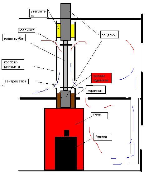 Дымоход будет железный. Появилась идея отапливать и мансарду, используя тепло от трубы. Хотим сделать как на рисунке. Скажите пожалуйста, работоспособна ли такая конструкция.
