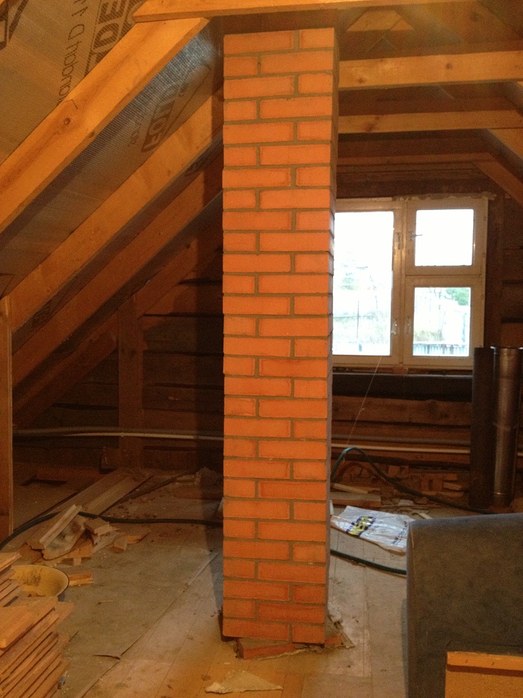 В итоге керамический дымоход установить не получилось, они дошли до потолка все таки посмотрели где находятся балки, попали на лаги и несущую балку и было решено дальше уводить дымоход в сторону печи и выкладывать кирпичом минуя лаги. Меня в этот момент не было. Клали 4 не полных дня.
