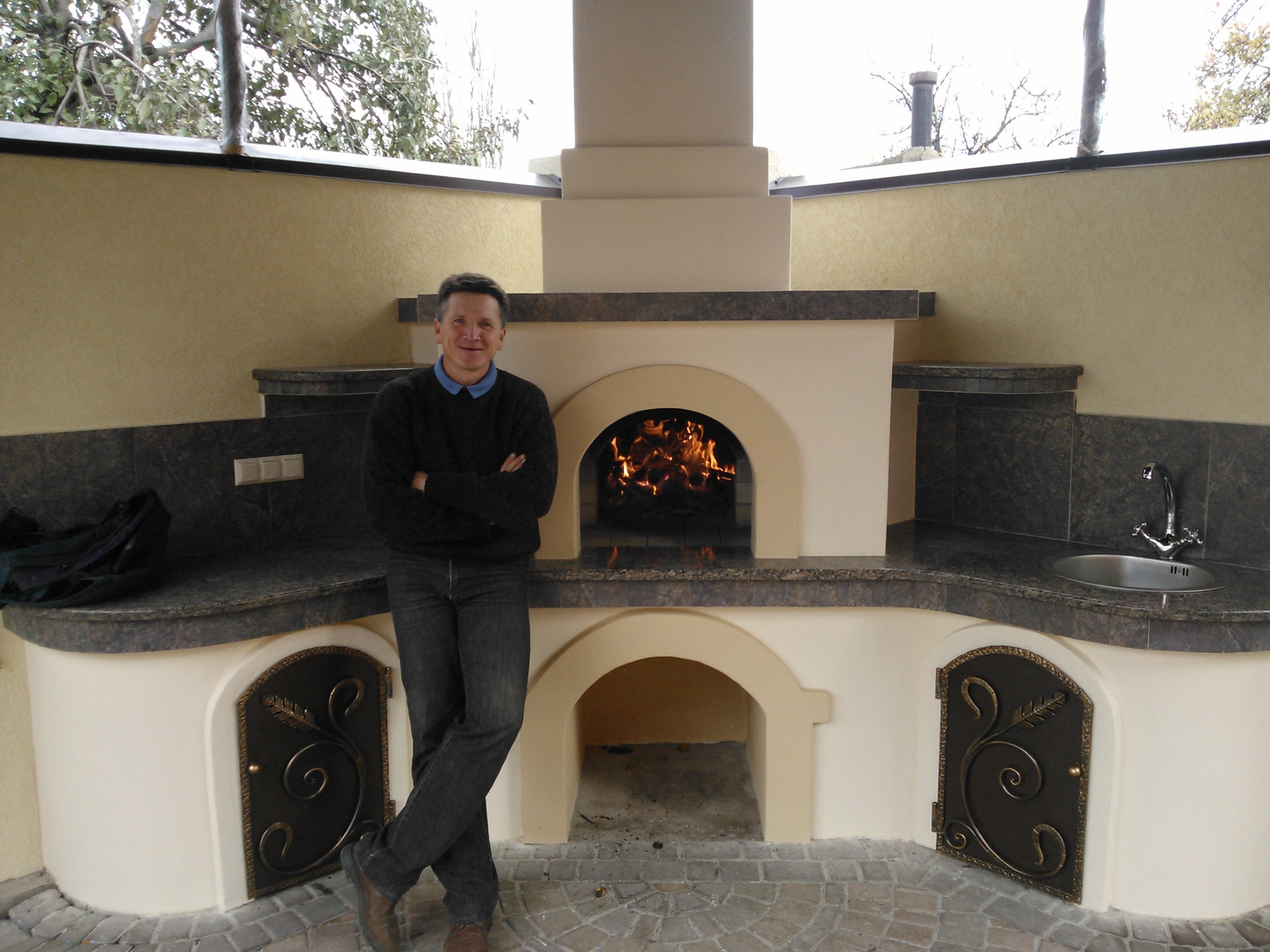шамотное ядро,термоизолированное каменной ватой 10 см. вся форма -обычный кирпич штукатурка по сварной сетке20*20 мм.шпаклёвка 225 церезит. Штукатурил какимто стартом из Епицентра ,пока держит без микротрещин. Привет Коля!