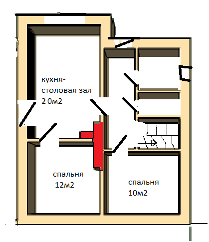 Отопить нужно три помещения на первом этаже : кухня-зал ~20м2, 2 спальни, а на втором этаже 2 помешения нежилые, мож когда на праздник дети приедут? (Мож металлическую печь на 2-й этаж). Стены каркасные толстые 30 см утеплителя, перегородки внутри планирую кирпичные, окна в каждом помещении, на кухне большое. С компом не очень, три дня рисовал то что Вы видите, на бумаге лучше получается (сканера нет). Так что не ругайте сильно. Высота потолков 2,8 м. С уважением Игорь. Интересует место установки и название плиты. Красным на плане нарисовал с сайта Кузнецова печь-стена (другого не придумал).