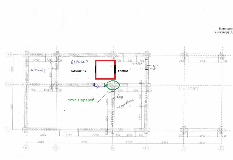 Сдвинуть печь вниз не даст угол переруба.