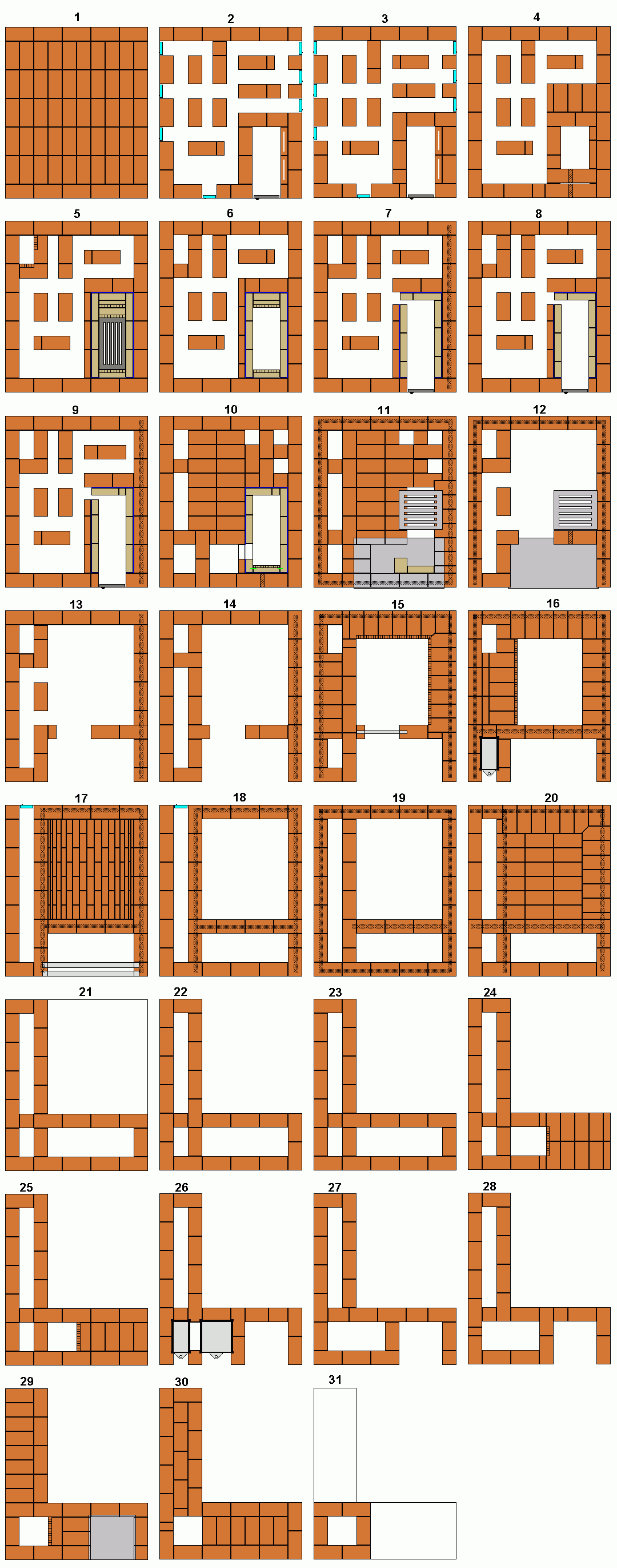 16. Вьюшка - кирпич предыдущего ряда в районе ручки выбрать минимум на 2 см или удлинить ручку так чтобы она выступала за периметр печи - критерием есть удобность открывания (ибо иначе она пройдут просто по предыдущему кирпичу - смотрим на сечения). Над вьюшкой в этом же ряду стоит кусок кирпича на ребро - на чертеже не показан - только на сечениях)