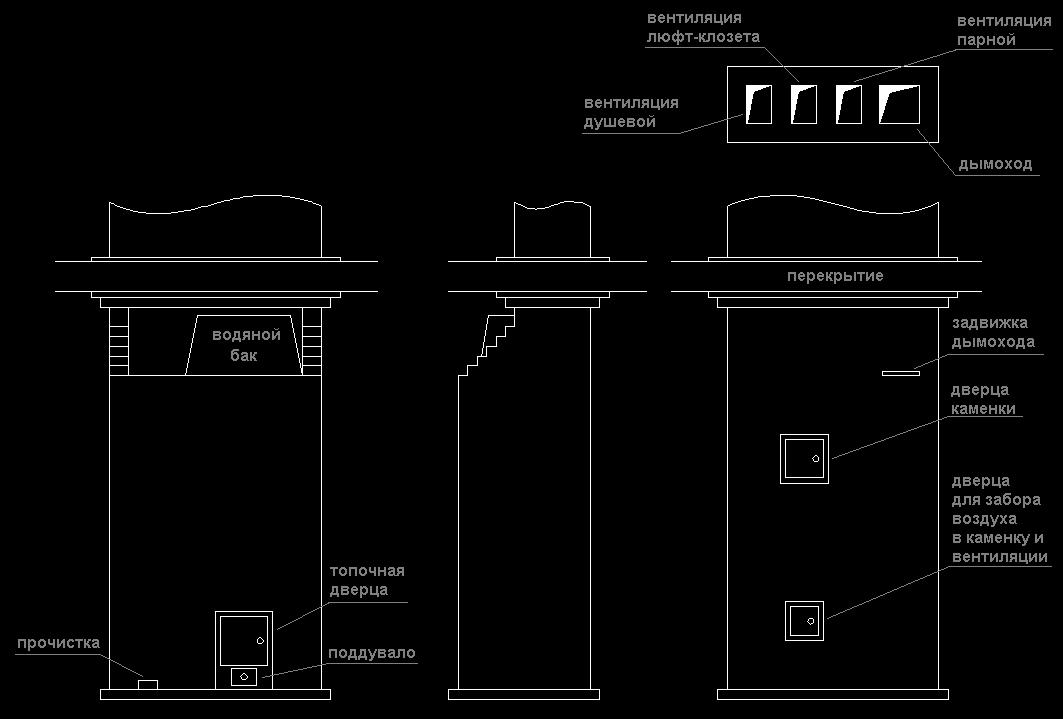 После нагрева бака газы, через один вертикальный дымооборот, выходят в трубу. Параллельно дымовой трубе в той же конструкции заведено три вентиляционных канала - вентиляция парной, вентиляция душевой и вентиляция ямы люфт-клозета.