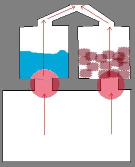 Бак с водой и каменка имеют задвижки внизу кружки красные два независимых дымохода из нержавейки проходят через бак и каменку и соединяются в один и выходят в общий дымоход.