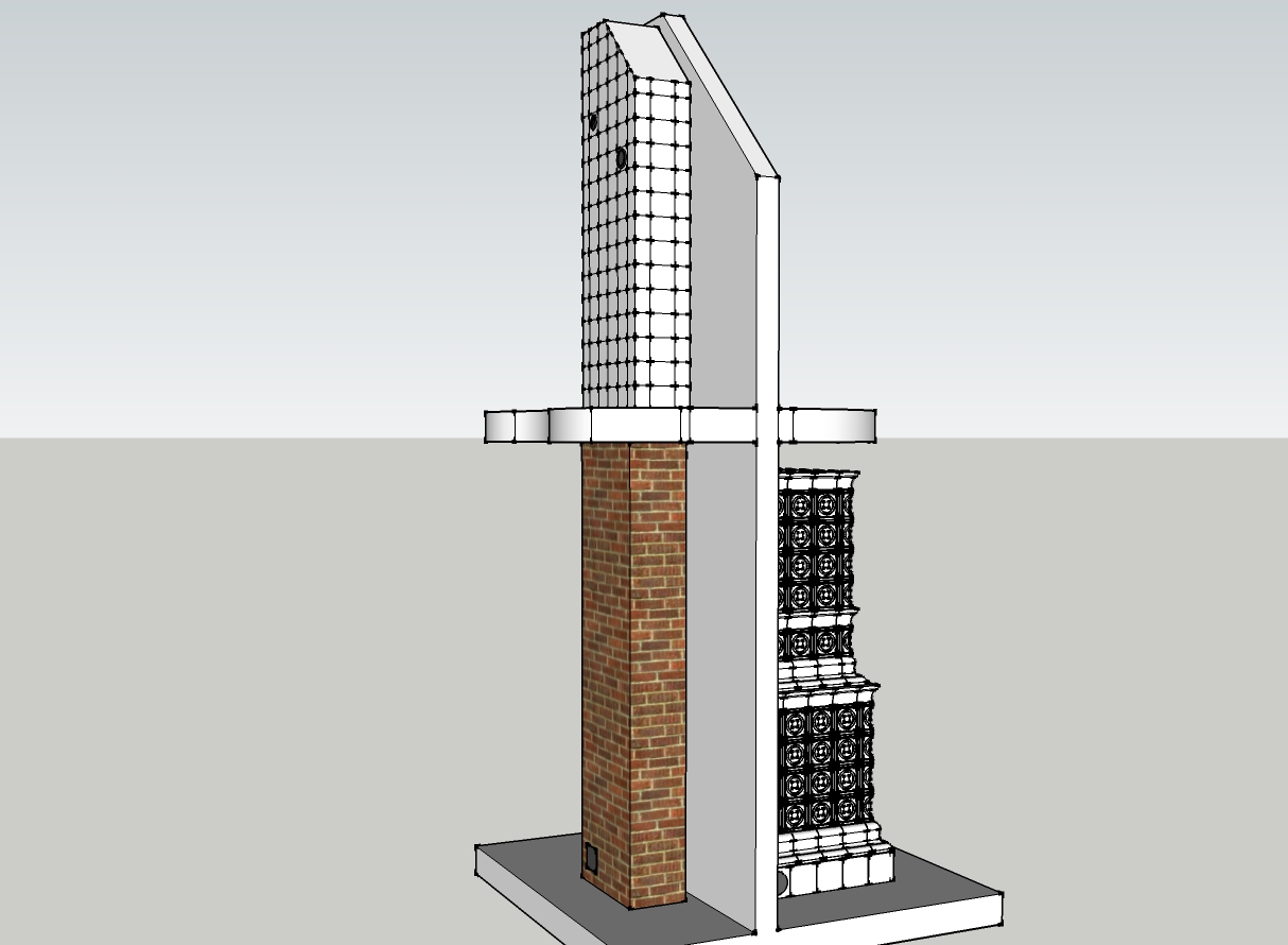 Приветствую печное сообщество. Готовлю проект по данной печи. Задача поставить изразцовую печь/камин на загородной даче + коренной дымоход+ каким то образом отопить спальню 2-го этажа этой печью. Появилась идея в теле коренного дымохода провести конвекционный канал на 2-й этаж, тепло снимать с задней стенки печи . Но есть сомнения... т.к. дымоход стоит не совсем рядом а через стену, под каким углом врезаться?? по 90 гр. или все же под 45 гр.. Затем ввергли в сомнения, пожелания заказчика об облицовке дымохода на 2-м этаже изразцами!? Вопрос ... к дымоходу изразцы вязать? или можно просто приклеить? Будет ли пробивать на наружнюю поверхность тепло от дымовых газов, проходящих по дымовому каналу? Т.е. изначально расчет был таков, что на 2-й этаж запускаем конвекцию + сама труба должна прогреться от дымовых газов. Для этого планировал нутрянку печи так, что бы на выходе из печи в дымоход, температура газов была не меньше 250 гр.. Теперь... с новыми вводными... уже и не знаю. Помогите развеять сомнения!