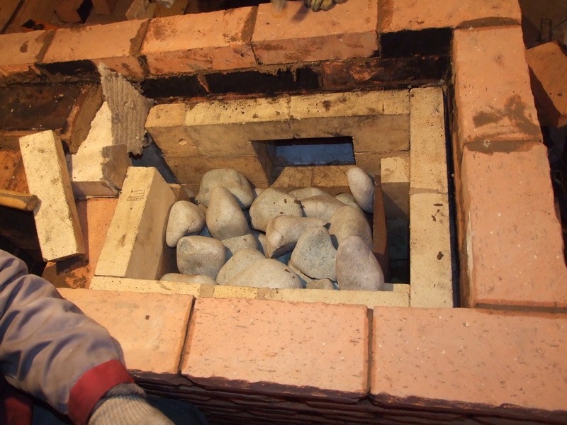 Мои предположения. Камни выкладывать таким образом, чтобы каналы (щели между шамотными кирпичами) оставлять максимально долго открытыми. Т.е. Первые камни ложить прямо на кирпичи, не выходя за его контуры, второй слой в виде перекрытия между нижними слоями, чтобы не завалился следующий слой в канал, и тд слой за слоем стараться выкладывать камни, чтобы они не перерывали каналы.