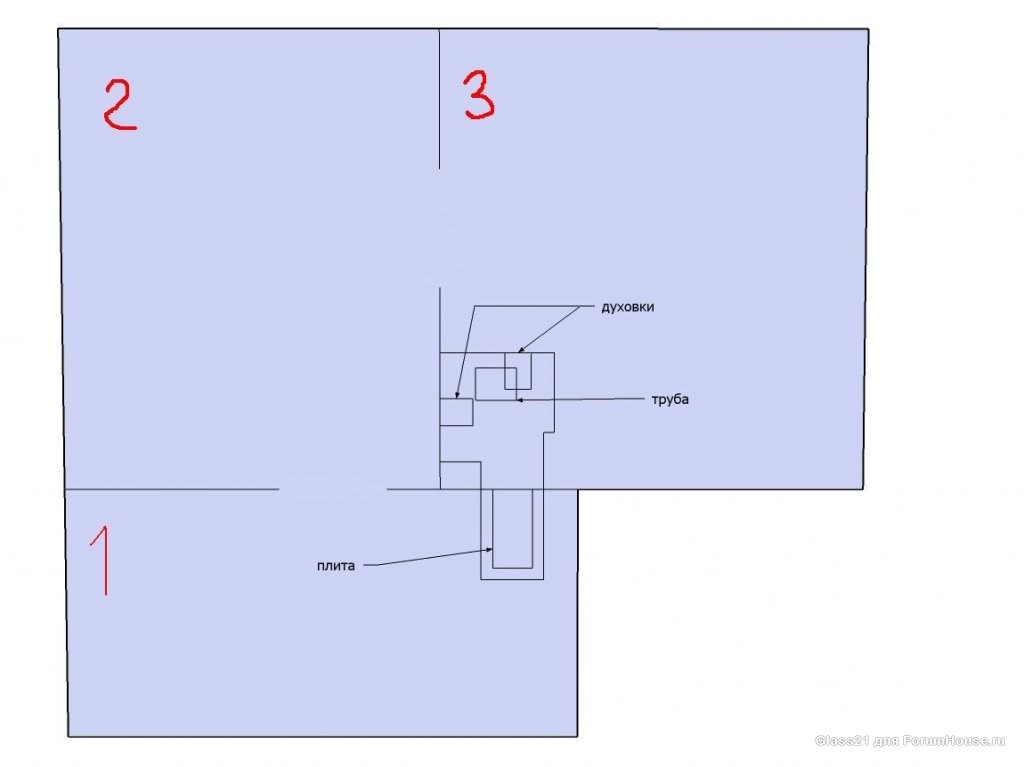 Топку лучше делать на кухне,т.е. в комнате 1. У нас вообще большинство новых домов строится с отдельной котельней,что бы мусор с дров домой не нести.