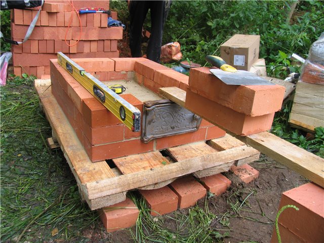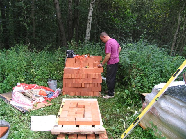 Тёплым воскресным днём 4 августа был сброшен военно транспортным манипулятором сратигисский запас кирпича на территорию Гуси, так скать Лебеди. Запас был сброшен точно в цель. В заросли сортовой крапивы задом с лужой. Ваш покорный слуга был сброшен с Маленькой Коллегой на следующий день и тут же приступил к работе. Задача стояла непростая, сложить РАБОТАЮЩУЮ банную кирпичную печь. Проект был свободный. но я всё же подстраховался и сделал порядовку из одного ряда у себя на даче.