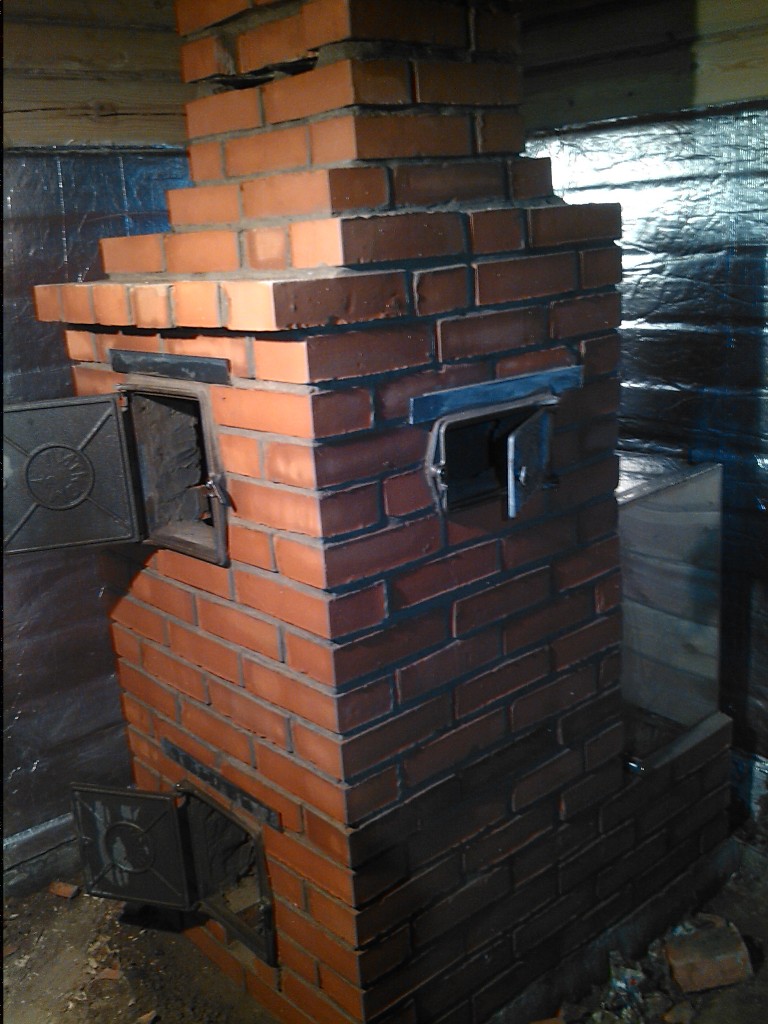 Печка и дымоход из обычного кирпича( гдето на 350-400 кирпичей), сечение дымохода в 4ре кирпича высотой примерно 1.5 метра + сэндвич- труба 150 / 210 для прохода сквозь крышу. Сама труба от конька крыши отходит на 50 см и возвышвется над коньком на 40 см примерно.